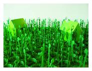 | Christophe Dalecki a longtemps hanté les quincailleries, les magasins de bricolage et les supermarchés, ne s’intéressant qu’aux objets en matière plastique de couleur verte. Il les assemblait sans recours à d’autres substances, pour réaliser des installations qui copiaient, non sans ironie, la nature. Il pouvait nous offrir d’imposantes végétations avec des plantes que l’on imaginait carnivores, foisonnantes, proliférantes, effrayantes, ou, à l’opposé, de petites compositions pleines de tendresse ou des calembours visuels. Pour le Bastille Design Center, il a conçu une installation intitulée Petites maisons dans la prairie ou Wild Culture vs Human Nature qui s’interroge sur notre place dans notre environnement, sur nos rapports au monde. Son processus de réalisation enchaîne plusieurs étapes. La matière première est constituée par des panneaux publicitaires imprimés sur des feuilles de plastique polypropylène alvéolaire, Akilux. Il détourne alors ce matériau publicitaire, en construisant, en volume, de petites maisons colorées, nous ramenant ainsi à un élément purement humain : la maison. Ces petites maisons sont alors photographiées en extérieur dans des contextes choisis pour établir un rapport entre environnement et présence humaine suggérée. En parallèle, Christophe Dalecki réalise, en intérieur, des sculptures et/ou installations utilisant les petites maisons dans des décors ou des mises en scène fabriqués, pour, là aussi, interroger ce rapport. Il fait ensuite imprimer sur des grandes plaques d’Akilux les photographies des petites maisons in situ en extérieur, bouclant ainsi la boucle en revenant aux panneaux imprimés de départ et à une habitude publicitaire. Il réutilise alors ces nouveaux panneaux dans un travail de découpe et de volume pour revenir à de nouvelles petites maisons qui, cette fois-ci, auront intégré, ingéré l’image de l’environnement. La boucle est refermée nous laissant dans l’interrogation. Dans une dernière phase, il réalise une installation de l’ensemble en mêlant photographies des petites maisons et installations de celles-ci dans l’espace. |