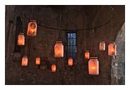 | Thierry Bedoux, parti de la peinture figurative, a progressivement évolué vers une forme d’abstraction nourrie par la fréquentation des arts premiers d’Afrique noire et par la lecture d’ouvrages ethnographiques. Dans un processus de retour aux sources, l’image prend alors, chez lui, une dimension magique et rituelle, visant à invoquer des présences invisibles plutôt que figurer des réalités tangibles ou visibles. Son activité au sein d’une compagnie de spectacle l’a conduit à sortir du confort de son atelier pour se frotter à des sites, à des thématiques et à des contextes variés dont il n’avait pas le choix. En abandonnant le cadre habituellement dévolu à la monstration des œuvres plastiques, il en est résulté des installations qui intègrent les dimensions publiques, sociales, humaines, économiques, culturelles et politiques de notre monde. Pour Thierry Bedoux, tout acte de création quel qu’il soit est d’essence politique et spirituelle : créer quelque chose, c’est modifier l’ordre du monde et c’est aussi imprimer de l’esprit dans de la matière. Son installation Les lucioles, parfois sous-titrée Les mémoires invisibles, part de matériaux banals, des bocaux suspendus transformés en lanternes, chacun incluant une image, du type de celles que l’on trouvait autrefois dans les albums de photographies de famille. Il s’agit donc ici, non pas de rendre visibles des souvenirs ou des événements passés, mais de susciter, chez le spectateur, un effort de recherche sur sa mémoire, sur sa propre histoire, réelle ou fantasmée. |