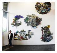 | Après avoir été céramiste, Frédéric Oudrix, pratique aujourd’hui la peinture à la gouache. Il s’exprime, avec une imprécision volontaire et préméditée, au moyen des paumes de ses mains et de ses doigts, sur de grandes feuilles de papier qu’il découpe ensuite et réassemble pour créer des végétations improbables et foisonnantes, dans lesquelles les vides jouent un rôle primordial. L’artiste déclare : Le temps passe. Le peintre s’adapte à l’éventuel ennui qui pourrait avoir raison de ces années de sacerdoce. Pour cela, j’ai délaissé progressivement les pinceaux au profit de la pulpe de mes doigts et de l’imprécision salvatrice de la paume de la main. Maintenant, les ciseaux sont les maîtres d’œuvre. Ils définissent les contours, les collages et les parties que l’on pourrait appeler vides. Les ciseaux conditionnent naturellement l’intégration de la peinture sur le mur et dans l’architecture. Alors, doucement la lumière du jour vient redessiner les contours. Je la remercie. Suspendues devant des murs, tels des décors de théâtre, ses compositions se comportent comme les frondaisons d’arbres – plus mentaux que réels – dont le bruissement des feuilles s’efface au profit de projections visuelles mouvantes sur les parois qui les accueillent. Le processus de déconstruction d’une végétation idéalisée se matérialise donc, chez lui, par un transfert et une saturation des sens, par une inversion des facultés perceptives. À sa façon, Frédéric Oudrix idéalise le monde végétal tout en dévoyant son essence. |