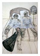 | La peinture de Catherine Wolff est directe et dure. Elle n’emploie pas de voie détournée pour asséner ses messages, comme autant de coups de poing ou de gifles à la figure du spectateur. Par exemple, dans L’oiseau de mauvais augure, un couple nu, alité, découvre avec stupeur, au pied de son lit, un bambin nu affairé, échappé d’une cage à oiseau voisine dont la porte est entrebâillée. On ne saurait être plus explicite pour décrire une maternité non souhaitée… Son trait, incisif, presque caricatural, et l’économie chromatique de sa palette, souvent réduite à des camaïeux de couleurs sourdes, évoquent la période misérabiliste de Bernard Buffet ou les œuvres de la même époque de Francis Gruber. Ses personnages, tour à tour convulsifs, honteux ou effarés, nous regardent de face, yeux dans les yeux, et nous prennent à partie dans un débat auquel on ne peut ni ne veut échapper. Catherine Wolff se défend d’être une provocatrice. Elle se veut juste révélatrice de ce que chacun porte en lui, comme elle dit fort clairement : en grattant un peu le vernis de chacun, l’image sociale, on révèle des aspects moins brillants. C’est ce à quoi je m’adonne. Mes personnages sont nus car ils révèlent, dans leur nudité, ce qui peut se jouer dans leur intimité et dans leur interrelation à l’autre. C’est cette dimension-là qui m’intéresse et que je mets en scène tel un metteur en scène. Et pour filer la métaphore, telle une comédienne, je ne me réduis pas à mes toiles. Je me contente de poser les situations, de placer les personnages. Loin de moi l’idée de donner une réponse. Les personnages sont en suspens. C’est au regardeur de conclure avec sa propre histoire. |
