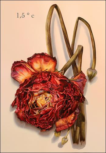| Sous le pseudonyme 1011 se dissimule une artiste grenobloise qui, depuis des années, proteste contre l’irresponsabilité de l’Homme en matière de dégradation de la vie sur notre planète. Selon ses propres mots, elle stigmatise « l’orgueil des Hommes qui, comme Icare, pensent pouvoir dépasser la Nature par la toute-puissance technologique et leurs activités industrielles et n’offrent que la Mort… » Dans sa série Vanité, elle évoque le drame du réchauffement climatique. Les fleurs fanées s’inscrivent dans la tradition d’une iconographie classique, comme une métaphore de la fragilité et de la déliquescence de la vie humaine, de l’Humanité entière. Au premier abord, le spectateur est renvoyé aux planches, démesurément agrandies, d’anciens ouvrages scientifiques consacrés à l’inventaire du monde végétal. L’inscription indiquant un incrément de température le ramène rapidement à la triste réalité. Les données affichées sont celles de différents scénarios étudiés par le GIEC (Groupe d’experts intergouvernemental sur l’évolution du climat), de la plus optimiste, tablant sur un réchauffement global de 1,5 °C en 2030, à d’autres, de moins en moins improbables, compris entre 3,3 et 5,7 °C. L’extinction des espèces, la malnutrition et les pénuries d’eau sont d’ores et déjà inévitables… 1011 tente d’éveiller nos consciences… |