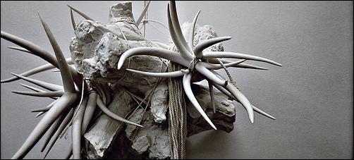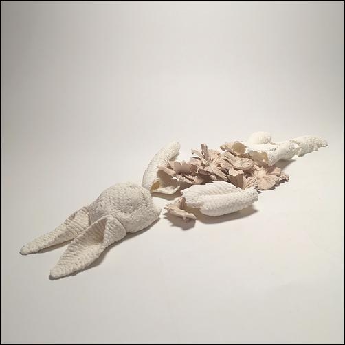 | Julie Poirée collecte au quotidien des objets abandonnés : ici un ruban sale, là un chiffon déchiré ou encore un drap fané, une peluche éventrée, un bas filé, une vieille sangle en tissu, un morceau de ficelle isolé, des fibres végétales ou animales inutilisées… Elle entrepose ces trouvailles dans son atelier, telles qu’elle les a recueillies, jusqu’à ce qu’une parenté, une association d’idées, une charge affective commune leur donne une nouvelle vitalité et leur ouvre une voie vers une forme de régénération, de résurrection pourrait-on dire. Viennent alors des opérations de pansage de ces objets, comme s’ils étaient en souffrance et requéraient un soin particulier. Elle les assemble, les emballe, les bande, les noue, les enveloppe, les recouvre de chaux ou de porcelaine. Ce sont, selon les mots de l’artiste : « des gestes structurants destinés à réanimer et recharger de sens une histoire désarticulée, une tentative de reconstituer l’être éparpillé au fil de son vécu, lui redonner chair et souffle. » De toute évidence, derrière ces nombreuses interventions empreintes d’attention et de patience, se dessine une volonté de reconquête d’une intimité perdue, de reconstruction d’un corps morcelé par les aléas de la vie. |
