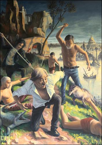 | Français d’origine chinoise, Quentin Liu est arrivé pour la première fois en France à l’âge de 24 ans, en 2002. Pour lui, né dans un pays totalitaire, l’artiste est avant tout un lanceur d’alerte. Témoin du changement radical de l’art contemporain chinois, il a été marqué par l’hostilité du gouvernement de son pays envers les artistes et par les campagnes de lavage de cerveau opérées par les principaux médias. Il a ainsi pris conscience de l’importance du rôle de l’artiste dans un contexte où la démocratie et la liberté d’expression sont sérieusement remises en cause. La politique, la mondialisation et le consumérisme sont les thèmes de prédilection qui irriguent sa peinture. Se référant souvent à Manet et à Delacroix, il donne à ses compositions un caractère quasi cinématographique. Devant ses toiles, le regardeur perçoit de multiples tensions dans les scènes qui y sont figurées : interrogatoires, inaugurations officielles, contrôles sanitaires... Les détails, souvent symboliques, dessinent une narration forte qui questionne le spectateur. L’artiste nous fait part de ses observations, suscite les interrogations, mais nous laisse la tâche de tirer des conclusions et de proposer des solutions potentielles. |