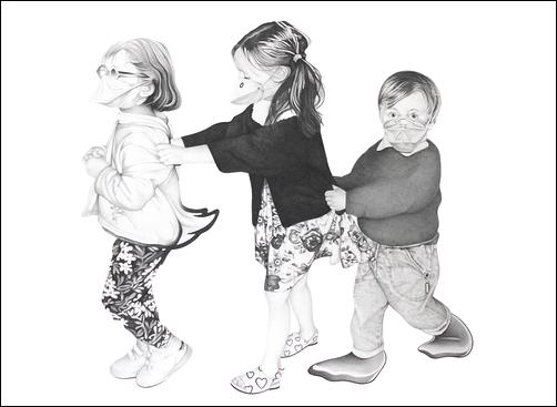 | De sa démarche, Aurélie Poux écrit : « Dans chacune de mes réalisations, je souhaite ouvrir un espace qui puisse permettre d’approcher, en douceur et avec la juste distance, un ensemble de thématiques qui ne sont pas privilégiées parce qu’elles sont susceptibles de provoquer la détresse, la tristesse ou le malaise. Mon travail s’appuie sur un univers enfantin, traversé par des figures rassurantes (communauté enfantine, petits animaux, jouets…) pour s’emparer de thèmes parfois compliqués. Ce choix est justifié par la manière très singulière dont les enfants appréhendent, comprennent et interagissent avec le monde. La facilité qu’ils ont à transformer ce qui les entoure ainsi que la capacité d’évasion et les ressources dont ils disposent face à l’adversité sont des facultés que j’essaie d’exploiter. Leur imaginaire, leurs jeux, leurs croyances et leurs rêves m’offrent la possibilité de raconter différentes épreuves de la vie. » Ce processus se retrouve dans le mélange des traits (tantôt précis et réalistes et tantôt très simples et imagés à la manière des enfants) et des éléments (jouets ou non) qui composent ses dessins. Pour autant, ils n’ont rien d’enfantin ni de puéril. Des anomalies ou indices, parfois discrets, invitent le spectateur adulte à s’interroger sur la véritable nature des objets et des scènes qui sont représentés et à remettre en question sa capacité d’appréhender le monde réel. |