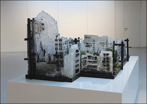 | Pauline Bétin travaille la pâte de verre. De façon assez paradoxale pour un matériau n’existant pas à l’état naturel, elle en use, combiné à de la sérigraphie et à quelques éléments végétaux, notamment du bois brûlé, pour constituer des paysages, aux dimensions certes réduites, qui évoquent la vastitude des zones de lisière entre les espaces urbains et ruraux. Ses constructions jouent sur de multiples oppositions : la translucidité du verre pour matérialiser le béton opaque des immeubles, la planéité de plans sérigraphiés pour habiller la surface de volumes très présents, la fragilité apparente du verre pour figurer la solidité de bâtiments destinés à résister aux intempéries, la compacité d’ensembles urbains pour enserrer et contenir l’expansion d’espaces végétalisés… On peut aussi y voir la confrontation entre les constructions censément raisonnées de l’homme et la spontanéité souvent considérée comme irrationnelle de la Nature, entre le verre filtrant la lumière et la photographie qui la capte, entre des images planes et des volumes massifs… Et bien d’autres encore… De son travail le plus récent, Pauline Bétin écrit : « Je m’intéresse plus particulièrement aujourd’hui aux fragments : fragments du temps avec ces ruines qui interrogent notre réalité présente entre patrimoine et ruine anticipée, mais également fragments de territoire en construction avec ces chantiers qui remettent en question l’homme bâtisseur érigeant toujours davantage en s’appropriant la nature. Mes sculptures sont toujours en rapport avec les éléments du paysage qui m’entoure. Je construis un monde utopique où: architectures et végétaux dialoguent dans un temps suspendu, figé dans l’image et le verre. » |