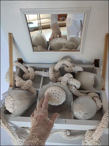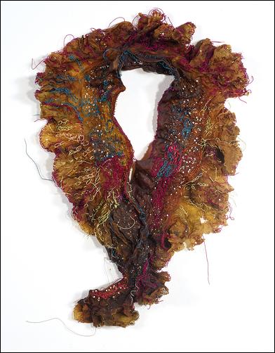 | Gaëlle Bosser récuse la dénomination de plasticienne et se dit artiste. Elle déclare : « Mon médium est la sensation. Je procède par assemblages. La diversité des matériaux – textiles, bois, verre, objets improbables détournés de leur usage ordinaire – caractérise ma pratique. Je laisse le corps et les lieux parler. La pensée peut s’absorber dans la soie, les fils, les écheveaux, les branches, les galets, les bribes d’Histoire de l’Art qui remontent à la surface. J’attends que resurgissent, des étoffes, des os, des muscles, du jardin, de la forêt, de la plage, le souvenir de mythologies intimes. » Son processus s’appuie sur des assemblages, des greffes, des boutures et des accumulations d’objets qui, pas plus que la machine à coudre et le parapluie sur une table de dissection de Lautréamont, n’auraient la moindre chance de se rencontrer dans la vraie vie. Ses compositions, ni abstraites ni figuratives, font souvent allusion au corps et à ses organes internes. L’artiste se laisse guider par les matériaux qu’elle a collectés, lesquels suggèrent des images à sa conscience, sans le moindre rapport avec leurs usages initiaux. C’est une forme d’intériorité, très fantasmée, qui finit par s’imposer à travers la combinaison d’un riche imaginaire personnel, nourri d’une connaissance approfondie de l’Histoire de l’art, et d’objets délaissés qui, eux aussi, portent un passé et des récits latents qu’elle tente de faire ressurgir. Le fréquent recours au textile ne catégorise cependant pas ses œuvres dans la rubrique des travaux de dames, pas plus que ceux de Louise Bourgeois, un de ses modèles revendiqués. Leur hybridité leur confère un caractère universel dans lequel chaque regardeur – homme ou femme, jeune ou vieux – pourra projeter son acquis personnel et développer une narration qui lui est propre. |