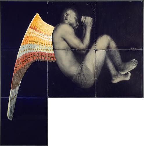 | Valerio Fasciani, restaurateur de peintures de son métier, a participé à de nombreux chantiers de réhabilitation de monuments historiques, en France et en Italie. Ces activités lui ont permis de s’imprégner des techniques et des thèmes d’un grand nombre d’artistes couvrant plusieurs siècles de création. Depuis quelques années, il développe sa propre pratique picturale, usant d’un large spectre de techniques : peinture, sculpture, photographie, installation… Pour autant, ses préoccupations n’ont rien de passéiste mais sont résolument ancrées dans notre temps, avec une prédilection pour les sujets en rapport avec la liberté individuelle ou collective. Ainsi, l’imposant Icare – L’Annonciation fait référence à un jeune immigré africain, débarqué à Lampedusa puis arrivé à Paris. Il est figuré en position fœtale pour évoquer la renaissance que représente pour lui le terme de son voyage, pourtant peuplé d’embûches. Son aile multicolore, qui contraste avec le noir et blanc du reste de la composition, est une copie fidèle de celle de l’ange de l’Annonciation d’une fresque de Frà Angelico, promesse d’un avenir meilleur. Ailleurs, sa série des Self Portraits est constituée d’installations en forme de cages. Elles emprisonnent la figure de l’artiste – adulte ou retombant en enfance –, lequel peine à s’en extraire et/ou se résigne à y rester. Ces prisons, ces barreaux apparemment fragiles, qui pourraient être aisément franchis, ne sont pas seulement ceux d’une peine infligée par un tiers ou par la Société mais aussi ceux que l’Homme s’impose à lui-même, la limite qu’il fixe, de son plein gré, à sa propre liberté… |