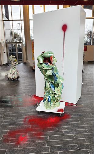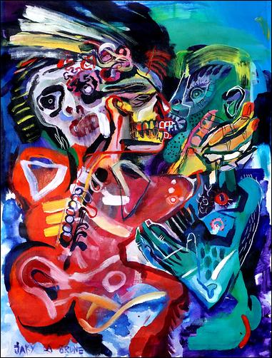 | Jaky La Brune, diplômée de l’École des Gobelins, a fait ses premières armes dans le monde de l’art underground. Elle découvre la peinture en réalisant des pochettes d’album. Elle définit son travail comme étant un exutoire vital qu’elle exprime par la peinture, la sculpture, la performance et la vidéo. Son inspiration plonge ses racines dans sa propre expérience de la vie, dans ses tourments et dans ses interrogations. On pourrait parler d’une forme d’auto-psychanalyse par le biais de ses productions plastiques. Ses thématiques de prédilection sont la violence du sexe, les déchirements de la passion amoureuse, les troubles de l’identité et, plus généralement, les émotions humaines, notamment les rapports plus ou moins inhibés de la douleur et de la sensualité. Les sujets convulsés et les couleurs criardes de ses toiles renvoient aux œuvres des artistes du groupe CoBrA, notamment à celles d’Asger Jorn. D’aucuns pourraient faire un parallèle avec les productions de l’art brut ou singulier des naïfs mais il n’en est rien. En effet, ses compositions, son registre chromatique et ses figurations d’anatomies déformées, malgré leurs excès, témoignent d’une connaissance approfondie de l’histoire de l’art, des primitifs à nos jours. On y retrouvera, d’ailleurs, des références religieuses, chamaniques ou littéraires... Plus du côté de Rabelais que de la comtesse de Ségur ! Jaky La Brune crée aussi des masques, des poupées, des sculptures, des costumes dont elle peut, à l’occasion, se revêtir. Dans ces œuvres, tout comme dans ses peintures, s’exprime un panthéisme rebelle et libertaire explorant un monde imaginaire toujours ouvert et prêt à absorber – à phagocyter, pourrait-on dire – tout ce qui s’en approche… Y compris le spectateur… |