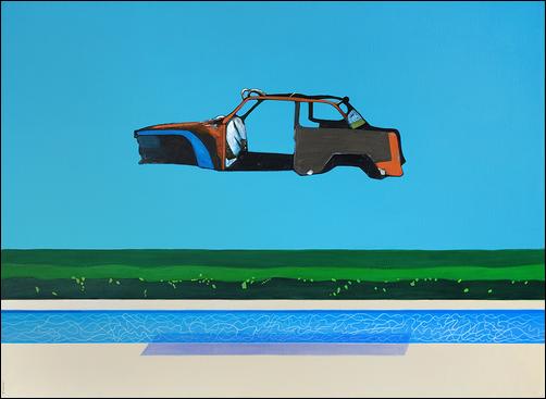 | Pour Patrick Santoni, chaque tableau est un questionnement, une recherche sur la compréhension du monde par l’utilisation de notre rapport au paysage. Sa technique, réaliste, procède par aplats colorés de couleurs chaleureuses, dans un esprit raffiné et séduisant qui rappelle celui des toiles de la Figuration narrative ou de David Hockney. Mais la comparaison s’arrête ici. Au lieu de décrire un monde idyllique ou féérique, Patrick Santoni essaie de nous sensibiliser à ce qu’il perçoit comme les profondes incohérences de notre société. En cela, son propos apparemment ludique et apaisant est, en fait, un violent réquisitoire contre des pratiques que nous jugeons normales, voire saines, et vise à remettre en question les convictions du spectateur. À cette fin, il juxtapose, dans ses compositions, de façon directe ou juste suggérée, des images appartenant à des univers disjoints. Il en résulte une très freudienne Unheimlichkeit, une inquiétante étrangeté… De sa série Pool with, il écrit : « C’est une série de piscines, débutée en 2021, directement inspirée des piscines de David Hockney. Les piscines de David Hockney des années 60 et 70 incarnent l’hédonisme, la joie de vivre, l’homosexualité et peut-être l’espoir. Aujourd’hui, leur sens me semble différent à cause de notre époque, des rapports du GIEC… Même si elles incarnent encore un certain hédonisme, elles véhiculent une image d’égoïsme. Elles symbolisent l’accès et surtout le non-accès à l’eau. Mes piscines sont des symboles de notre comportement humain. Ce sont des idées de piscines, imaginaires, placées dans des lieux improbables. Ces piscines sont des flaques d’eau, des bassins, des mares, des puits… Je participe aux dérives humaines que j’expose à travers mon travail : je suis acteur et coupable. Nous créons un monde où: beaucoup auront des piscines indésirables et d’autres auront des puits asséchés. » |
