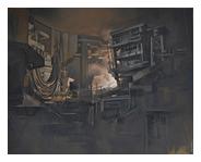 | Astrid Delacourcelle s’intéresse aux paysages industriels ou urbains, avec une prédilection pour les fonderies, les usines métallurgiques, les raffineries, les minoteries, les gazomètres, les cheminées d’usines, les docks portuaires, les HLM… Sa technique combine une forme d’hyperréalisme froid, dans la construction des toiles et dans le rendu des détails, avec une chaleureuse expressivité, notamment dans la touche et le rendu chromatique. Elle montre une évidente empathie pour ces lieux dans lesquels la présence humaine n’est jamais figurée, mais juste suggérée. On ne sait d’ailleurs pas décider s’il s’agit de ruines industrielles ou d’équipements encore opérationnels. L’artiste s’applique à mettre en opposition la simplicité fonctionnelle de bâtiments où rien n’est inutile et leur complexité résultant de leur fonction productive présente ou passée. Quoi qu’il en soit, le silence et le recueillement semblent de rigueur, devant cette sorte de stase d’un temps qui semble définitivement figé… Dans le traitement des ombres et des lumières, Astrid Delacourcelle recourt à des techniques ancestrales qui la placent dans la descendance de la grande peinture classique, si ce n’est que les cathédrales d’autrefois sont devenues des usines, les maisonnettes des barres urbaines, les ailes des moulins des silos à grain… |