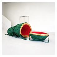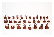 | Hélène Delépine a relevé le défi, ô combien périlleux, d’investir les imposantes rangées de casiers de l’escalier du Bastille Design Center. Elle y installe un grand nombre de petites structures, des pièces uniques modelées en grès rouge de sa série Les feus lotis. De ces œuvres, comme des autres présentées ailleurs, elle écrit : « Mon travail est un jeu de construction d’images fait d’expériences d’assemblage et de combinaison qui fonctionne par déplacement, translation ainsi que par l’usage du signe et de l’indice. Inspirée par des figures simples issues de mon environnement quotidien, j’aime produire des rencontres inhabituelles, des nouvelles cohabitations, des formes de déplacements : elles ouvrent un champ de possibles pour questionner l’expérience du réel et le pouvoir de l’œuvre comme fiction. Entre la résistance et la fragilité, le rigide et le dissolu, le géométrique et l’approximatif, j’opère selon des principes de dualité et de contradiction. J’instille le doute en mettant à jour le potentiel fictionnel du réel, lui empruntant un répertoire de formes et d’images ayant une capacité à s’abstraire. À la lisière entre ce que le regard peut identifier et ce qui lui échappe, entre le déterminé et l’indéterminé, ce qui peut être appréhendé ou non, mes propositions plastiques visent à perturber des habitudes et une certaine logique commune tout en ouvrant vers des imaginaires subjectifs. L’étrangeté et l’ambigüité impliquées dans les œuvres et qui résultent de ce processus de travail questionnent des éléments qui nous semblent, de manière ambivalente, familiers et éloignés. » |