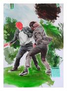 | Danielle Gutman Hopenblum a reçu une formation d’ingénieure avant de se consacrer aux arts plastiques. Les traces de sa formation initiale restent très présentes dans bon nombre de ses œuvres, tant individuelles qu’au sein du NeoConsortium dont elle est cofondatrice. Elle travaille simultanément sur plusieurs séries qui semblent indépendantes les unes des autres mais partagent cependant la caractéristique, selon son propos, d’être « le tissage d’une représentation picturale classique et d’une représentation symbolique, schématique » Sa série Les aventures héroïques d’un groupe de peintres contemporains est constituée de peintures sur papier réalisées à partir de scènes d’action extraites de films de genre. Elle aborde ainsi l’action telle qu’elle est présentée dans le cinéma populaire et distillée dans notre inconscient collectif, le plus souvent violente et conflictuelle. Elle la rapporte alors à son propre mode d’action, le travail de peinture. Elle écrit : « Sortir ces stéréotypes de leur espace d’origine pour les emporter dans l’atelier me permet d’envisager une issue à leurs bagarres incessantes. La violence est réduite à un sujet d’étude et c’est le moment de la peinture qui devient le moment de l’action. […] Je laisse apparents tous les aspects du travail (les remords, les coups de pinceaux, le blanc du papier, les scotchs qui tiennent la feuille sur le mur) et les commentaires que j’ajoute sur des post-it me permettent d’emmener l’histoire sur un autre terrain. » |