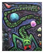 | L’univers pictural de Wil Green fait écho à son parcours atypique et éclectique : études de dessin classique, recherche en neurosciences, cadre supérieur dans une entreprise du CAC40, consultant indépendant… Ses toiles, souvent sur fond noir ou sombre, surprennent d’emblée. On y voit des créatures étranges, des monstres probablement débonnaires dans un environnement grouillant de vie, d’objets ou de végétaux incongrus. Les lectures sont multiples, l’artiste ne forçant pas la sienne, même si les dragons verts étranglés par des mains d’extraterrestres font évidemment référence à ses inquiétudes sur le sort de la planète… Mais le spectateur est libre d’y plaquer une autre histoire, la sienne… Ce fatras, selon l’expression de l’artiste, ce foisonnement bouillonnant, n’est cependant pas vide de sens. Il est même savamment structuré pour nous mener vers un ailleurs, toujours selon ses mots, par un parcours qui, même si sa destination reste libre, ne manque pas de nous interpeller, de fouiller nos consciences et de poser clairement les problèmes de notre société déshumanisée. Le tout non sans un certain humour qui nous aide à surmonter nos peurs devant un avenir de plus en plus incertain. À ne pas confondre avec la vacuité stérile de certains de ces innombrables art-brutistes qui n’ont rien à nous dire. |