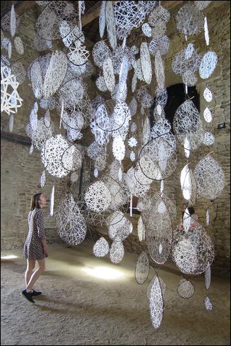 | Le trait et la fibre sont au cœur des travaux de Sibylle Besançon. Pour les œuvres présentées ici, ce sont des ronces, des fils et du coton. Ses réalisations empruntent aux techniques traditionnelles de la dentelle, du tissage et de la vannerie, donnant à la notion d’ouvrage de dames une nouvelle résonance qui n’a rien de désuet ni de mièvre. Les ronces et leurs épines peuvent servir à dessiner des lignes dans l’espace, maintenant en tension des fils pour former les raquettes ovoïdes qui jouent le rôle de grosses gouttes d’eau dans son installation Il pleut des gouttes. Ailleurs, elles sont nouées de façon compacte pour former une sphère, grosse pelote ou planète improbable, légère et piquante, attrayante et menaçante, suspendue au-dessus du sol. Ailleurs encore, taillées en segments de longueur homogène, elles sont comprimées pour former une galette circulaire posée au sol, dont le centre attire le regard comme l’œil d’un cyclone. Dans tous les cas, ces pièces, dont le développement semble arbitrairement arrêté, se posent en métaphore d’une croissance vitale qui échappe au contrôle humain. |