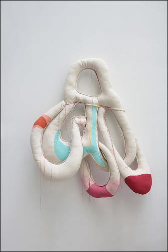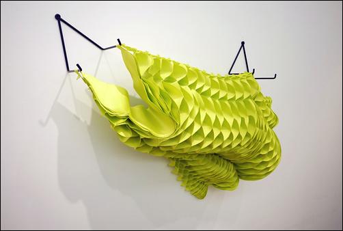 | Les œuvres de Lydie Chamaret s’intéressent à l’enveloppe corporelle – habits ou peau – en recourant principalement aux tissus – avec une prédilection pour les satins – et aux techniques permettant de les mettre en forme : couture, dentelles, plissés, tombés... Parfois à des matériaux moins conventionnels dans les métiers de la confection : fils métalliques, grillages, latex… Certaines pièces peuvent être nomades, destinées à être portées comme des vêtements, d’autres exposées comme des sculptures muséales autonomes, d’autres enfin se présentent comme d’improbables et dérisoires étuis protecteurs pour des objets banals. À bien les observer, au-delà d’un aspect ludique qui évoque les guirlandes et les confettis des manifestations carnavalesques ou des travaux enfantins de découpage et de dépliage, on y découvre de multiples processus d’hybridation ou de greffe. Les travaux de Lydie Chamaret convoquent, discrètement, le genre humain, l’animal et, parfois, le végétal ou le minéral. De véritables métamorphoses en action ou en devenir… Certaines de ses œuvres peuvent être pliées pour le stockage et ne prennent leurs dimensions réelles que lorsqu’on les étire, comme un accordéon, pour les déployer dans l’espace, horizontalement, entre deux supports métalliques, ou verticalement, suspendus au plafond : épiphanie du regard... Les vides y jouent un rôle prépondérant, comme dans la dentelle, pratique que Lydie Chamaret revisite et réactualise aussi en usant des fils métalliques. Dialectique du plat et du volume, du plein et du trou… Dans tous les cas, il s’agit avant tout de transgressions… Mais présentées de façon apparemment anodine… Pour mieux piéger le spectateur et le pousser à exercer son propre jugement… Une des fonctions essentielles de l’art… |
