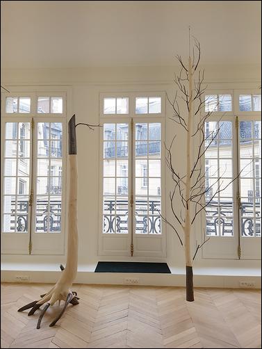 | De son travail, Lélia Demoisy écrit : « Mélanger les matières du vivant, peau, corne, bois… aux matières inertes du travail de l’homme redessine tout l’éventail de nos rapports à la nature et en bouleverse ainsi notre compréhension. Les pièces que je crée abordent les notions de corps et d’individu. Elles posent la question de l’utilisation de la matière du vivant, quelle qu’elle soit, comme ressource et, à l’inverse, la question de notre intervention dans les mondes clos de la nature. Mes recherches questionnent nos rapports avec cet environnement dont nous sommes issus et qui, par moments, nous paraît si éloigné. J’interroge ce lien, jamais neutre, que nous avons avec ces autres formes de vie. Il y a cohabitation, désir d’harmonie, rêverie, mais entre aussi en jeu la question du pouvoir, de la maîtrise, voire de la survie. Et il nous plaît de penser que nous pouvons être les grands organisateurs du monde, l’observant dans sa globalité avec détachement, alors que, en réalité, il n’y a aucune frontière. » |