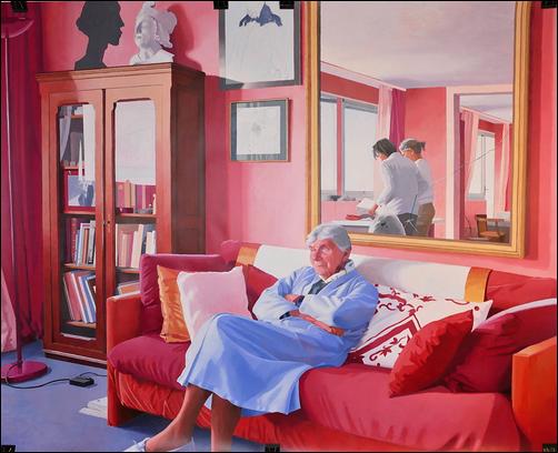 | Antoine Denain est peintre et dessinateur. Ses sujets sont ceux de la vie quotidienne, dans des cadrages serrés qui évoquent la photographie de reportage ou des photogrammes de films. Ses instantanés saisissent des personnages pris dans des actions insignifiantes, mais auxquels la mise en page confère une dimension imposante et énigmatique. Bien que ne se livrant à rien de spectaculaire ni digne d’intérêt, ces êtres nous interpellent, nous déstabilisent et nous questionnent. Ils sont tellement présents que toute identification avec eux, toute projection du spectateur dans leur rôle devient impossible. Pas de désintérêt ni de distanciation, cependant, car ils aspirent le regardeur dans un monde mystérieux dont aucun indice ne permet de deviner les enjeux. Il ne s’agit pas de prendre leur place, mais de devenir leur interlocuteur et, peut-être encore plus, des enquêteurs chargés de percer le mystère qui les entoure. De reconstruire ou d’inventer une histoire dont ils seraient les acteurs… Au-delà de la prouesse technique de son hyperréalisme, Antoine Denain s’inscrit dans la descendance de la grande peinture, notamment des Hollandais du siècle d’Or, auxquels il emprunte la technique du modelé des ombres et la subtilité dans le traitement de la lumière. Ceci a pour effet d’exacerber la personnalité des personnages mis en scène, qui, malgré leurs occupations banales, transmettent un sentiment de plénitude et d’intense méditation, comme s’il s’agissait de peinture religieuse. Une façon de traduire l’héroïsme du quotidien cher à Kierkegaard… |