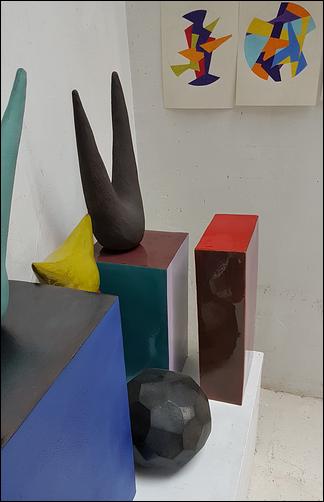 | Pierre Corthay, bottier de formation et de métier, utilise les emballages les plus divers comme matière première pour ses travaux : cartons, coques thermoformées, matières plastiques, cales… Il les découpe, les assemble, les colle et les peint pour réaliser des volumes, de dimensions modestes, dont l’aspect évoque des matériaux plus nobles : bois, métal, porcelaine, céramique, terre cuite… Il les présente sur des étagères, comme les trophées d’un improbable cabinet de curiosités, ou accrochés au mur. Au-delà du propos sur la possible rédemption d’objets normalement voués au rebut, sa démarche a pour effet d’inverser les rôles. Ce qui était initialement conçu pour être contenant, creux, devient, par son action, contenu potentiel, convexe. L’accessoire se mue en objet digne d’intérêt… L’échelle des valeurs est subvertie. La chose dénaturée par son usage est, en quelque sorte, renaturée par l’intervention de l’artiste… Les couleurs sont chaleureuses, gourmandes comme celles de confiseries, contribuant, non sans malice, à brouiller encore un peu plus les pistes et à mener le spectateur là où il n’irait pas de lui-même. |