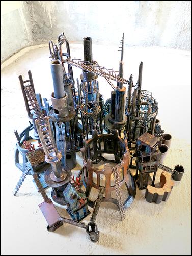 | The Lost City of J de Jeanne Rimbert est, selon les mots de l’artiste, la cartographie d’un monde imaginaire devenu espace d’installation. Elle y empile des éléments disparates dans des équilibres instables, échos de la précarité et de la fragilité de nos vies. Ce reliquaire profane, simultanément attirant et repoussant, peut être lu comme la trace d’une civilisation perdue, le chaos dont sortira un monde nouveau, la volonté désespérée de résister à l’inexorable effacement de toute activité humaine ou un champ archéologique conservant les témoignages d’une activité passée, la nôtre ou celle de l’artiste… Jeanne Rimbert a relevé le défi de meubler les casiers de l’escalier du Bastille Design Center en y présentant des pièces qui font miroir à The Lost City of J et à l’architecture de type Baltard du lieu. Elle exploite des motifs présents dans les deux environnements – plaques au sol, colonnes en fonte, gouttières, grilles, croisillons, verrière… – qu’elle décline sur de fines plaques extrudées en terre noire émaillée, de la taille des casiers, et placées devant certains d’entre eux, ne les obstruant que partiellement. La cage d’escalier se transforme ainsi en une sorte de ruche ou en un complexe d’habitation aux multiples cases normalisées, mais contenant, chacune l’espoir d’une vie potentielle. |