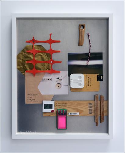 | Les assemblages d’Arnaud Bodaire sont constitués à partir d’éléments récupérés dans son environnement proche : menus objets, images de magazines, traces du quotidien... Après les avoir collectés, il décide d’en choisir certains pour leur potentiel mémoriel et de les associer avec d’autres pour réaliser des compositions, présentées dans des boîtes plates, accrochées au mur. Ces pièces évoquent une multitude de choses, depuis la collection entomologique jusqu’à une relecture, corrosive et/ou ludique, de notre condition humaine. Elles se muent parfois en mécanismes faussement utilitaires dont la finalité échappe totalement à l’observateur. Au-delà de la parenté formelle avec les boîtes de Joseph Cornell, c’est plutôt à l’installation La vie impossible de C.B. de Christian Boltanski que ces compositions font écho. Il s’agit, en effet, avant tout, d’un travail sur la mémoire qui questionne les moyens mis en œuvre dans la transmission, pour lutter contre l’oubli. On pourrait, selon les propos d’Arnaud Bodaire, parler de capsules temporelles, de chercher comment laisser une trace de ce qui a existé… Il poursuit : « En effet à travers une mise en scène plastique et visuelle réalisée à partir d’éléments autobiographiques (carte d’autorisation de sortie du territoire pour mineur…), des photographies floues ou ratées tirées de l’album de famille, des objets ou parties que j’ai conservés, des jouets… je propose des fragments de vie, des synoptiques visuels qui pourraient s'apparenter à des autoportraits. » Arnaud Bodaire donne une égale importance aux matériaux, aux formes, aux couleurs et à leur capacité expressive, jouant sur des correspondances ou des oppositions latentes, à découvrir par le regardeur. L’équilibre de la composition est tout en tension, souvent proche de la rupture. L’artiste s’appuie sur un processus ancien, celui du collage, mis en œuvre avec une volonté de transformation d’objets sans intérêt en acteurs d’une narration qui peut être, selon les cas, critique, expressive, affective ou purement esthétique. Le propos n’est cependant pas clos d’emblée. Il écrit : « nombre de mes créations sont des points de départ et je n’ai pas de certitudes. J’ouvre des pistes que je peux développer, laisser en suspens ou reprendre à différents moments. » C’est donc au spectateur de leur donner leur pleine signification, laquelle est laissée ouverte à la subjectivité de chacun. Quels que soient les objets qu’il collecte, l’artiste tente à chaque fois de les transposer dans un contexte différent de leur lieu d’origine, pour leur donner une nouvelle signification. Parfois il les érige en totem à l’aide de tubes d’acier depuis des socles en pierre. Ces objets, autrefois invisibles, font désormais signe de par leur positionnement en suspens. À travers ce dispositif, l’artiste cherche à questionner le monde qui nous entoure. |