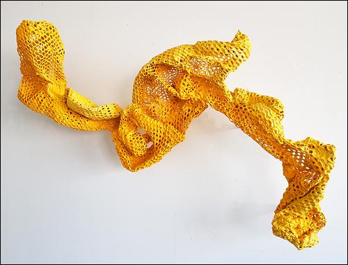 | Les sculptures d’Aude Borromée, architecte de formation, sont construites sur une ossature en grillage à poule déformé, torsadé, distordu… Sur ce treillis, à la fois souple et rigide, sont appliqués des pigments de couleurs vives, mais aussi, dans certaines pièces, des épidermes de matière opaque – papier recyclé, mortier… –, eux aussi colorés, qui couvrent partiellement ou totalement la structure sous-jacente. Le contraste entre le caractère massif de ces apports et la légèreté de la grille porteuse est saisissant. Ces pièces, qui s’inscrivent dans la lointaine descendance des figurations physiologiques d’écorchés, jouant sur les variations de densité des mailles du grillage pour figurer l’élasticité d’un épiderme, nous parlent de peaux, d’os et de chairs, de corps probablement blessés, pris dans des convulsions, arrêtés en pleine action... On pense irrésistiblement aux moulages de ces cavités laissées vides par des êtres vivants saisis, à Pompéi, dans les cendres de l’éruption du Vésuve. Il y a du minéral, du géologique, du tellurique dans ces œuvres, mais, avant tout, elles affirment, contre vents et marées, la présence d’un vivant qui résiste à toutes les agressions du temps. Elles interpellent le regardeur qui ne peut éviter d’établir un parallèle avec sa propre structure anatomique. Il est invité à un dépassement de sa réalité corporelle, obligé de confronter son existence à l’altérité de tiers inconnus, à découvrir. L’artiste s’exprime à ce sujet : « mon travail s’apprécie par le corps, nous plonge dans une confrontation immédiate avec la matière, le temps présent et dans une relation directe avec l’être. L’acte plastique crée une interface physique où créateur et spectateur sont reliés par l’œuvre, par sa représentation hors normes de notre environnement où chacun peut éprouver plus fortement sa vitalité et sa présence au monde. » |