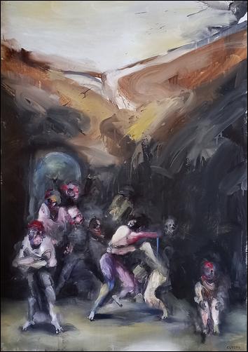 | Nicolas Cluzel pratique exclusivement la peinture. Il s’intéresse aux chefs-d’œuvre des siècles passés et en propose une relecture grotesque, granguignolesque et déjantée dans une tradition qui est celle de la farce et de la fête populaire débridée, dans une filiation directe avec les œuvres de la tradition flamande de Bosch, Bruegel ou Ensor. Bien que privilégiant la vitesse d’exécution, Nicolas Cluzel a longuement observé les maîtres du passé pour en tirer des leçons et y puiser des caractéristiques qui irriguent ses œuvres. On y trouvera, notamment, des traces de l’expressionnisme matiériste de Rebeyrolle, des éclaboussures gestuelles à la Pollock, la technique de badigeonnage de certains street-artists, le grouillement narratif d’un Erró, la truculence jubilatoire des Flamands de la Renaissance, le souci de l’actualité de certains dessinateurs de presse, les rencontres ou confrontations improbables chères aux surréalistes, la prégnance libératoire de la couleur des Nabis, les mises en page inspirées des écoles orientales… Sa longue pratique de la bande dessinée est aussi perceptible dans la dislocation de ses personnages et dans l’exagération des physionomies expressives. Ce mélange détonant et détonnant, cette expression d’un flagrant délire, d’une gourmandise goulue et jouissive pour l’acte de peindre, constituent d’évidents hommages, de claires déclarations d’amour à la peinture et à son histoire. S’ils prennent parfois la forme de la dérision, ce n’est que pour exorciser les tragiques convulsions et les douloureuses grimaces de l’acte créateur. Christian Noorbergen a écrit : « Nicolas Cluzel est un bougre-à-peindre qui étreint tous les délits délurés d’une peinture à grands délires. Il ne craint pas la chute libre, et abandonne tous ses repères. Il sait lâcher ses coups d’art à coups acérés de scalpel mental. Ses traits esquissent des apparences violentes, déchirent les attendus graphiques, et outrepassent les périmètres normes. Il œuvre à l’arrache, et ses arrachements cruels crucifient la séparation d’origine, quand le corps humain, pour faire exister l’humanité, prend distance tragique avec le corps de l’univers. Nicolas Cluzel sait oser l’abîme. » |