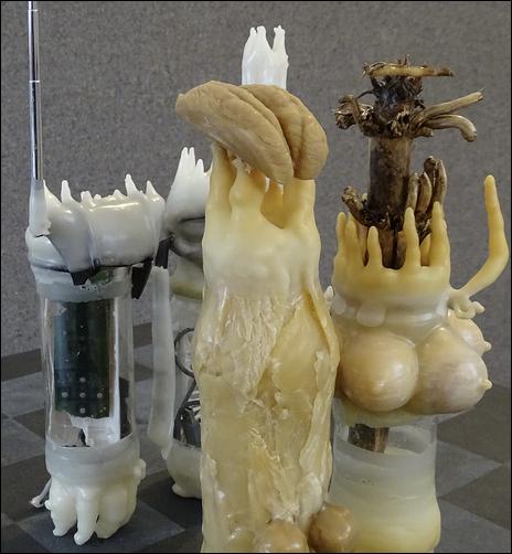 | Véronique Roca intègre très tôt la cire d’abeille parmi ses matériaux de prédilection et développe des ensembles d’œuvres où la contemplation, l’énigmatique et l’humour se croisent. Max Lanci a adopté la paraffine comme liant, pour ses analogies sensorielles avec la peau humaine : translucidité, tiédeur, lent vieillissement. Ils ont décidé de collaborer pour nous présenter un projet à quatre mains. D’emblée la thématique du jeu d’échecs s’est imposée à eux, entre connivence et antagonisme : deux camps jouent, se mêlent, pour construire inextricablement jusqu’à un point final. Une confrontation entre matériaux proches, radicalement dissemblables, mais pourtant miscibles. Les pièces noires se distinguent en cire, les blanches en paraffine. Elles sont réalisées par assemblage de matériaux hétéroclites – verre, ficelle, végétaux, coquilles d’œufs, métal, plastique, cheveux, cendre… – : tribu Dada d’enfants naturels, rejetons d’ex-voto nord portugais et de fétiches vaudous africains. Parmi les échiquiers concoctés par Véronique et Max, l’un est mis à disposition des visiteurs, leur permettant de jouer sur place. Un autre figure une partie historique, figée dans sa phase critique : celle du 10 février 1996 entre l’ordinateur Deep Blue et Gary Kasparov. L’ensemble du projet est complété par des figures liées aux échecs ou à une réjouissante mystique de la babiole : Mission impossible, L’éveil de la Kundalini, Pièces en deux clics et trois claques... Le duo a aussi relevé le défi que nous lui avons proposé de peupler les casiers du grand escalier du Bastille Design Center. Les deux artistes se sont bien gardés de nous dévoiler la nature de leur projet mais nous ont promis la surprise… Nous n’en doutons pas… |