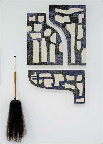 | Ema Duval brode. Elle recourt à cette technique, lourde de connotations passéistes, pour nous livrer des œuvres qui s’inscrivent pleinement dans notre temps. Les formes qu’elle produit nous semblent familières, au premier abord, mais le regardeur a bien du mal à en identifier l’origine : peut-être des projections planes d’objets tridimensionnels réels ou fictifs, appartenant au monde urbain, rural ou domestique… On pourra reconnaître ici l’ombre d’une chaise, là d’une table, ailleurs d’une cage ou d’une herse… mais le doute subsiste et d’autres lectures émergent sans pour autant s’imposer… Pour brouiller un peu plus les pistes, Ema Duval présente, le plus souvent, ses pièces dans des installations, combinées avec des objets indéfinissables, sortes de fétiches réalisés en passementerie, en filasse, lambeaux de tissu, bois, zinc, papier, balais, bobines, épingles… Le dépaysement est complet. Ce qui frappe avant tout, dans ses broderies, souvent monochromes ou dans une subtile bichromie, c’est l’opposition des lignes épaisses et des grandes plages blanches qu’elles enserrent : des fantômes de formes. On pense inévitablement aux plaques résiduelles d’un processus d’estampage de pièces mécaniques dont l’usage reste incertain ou bien à des gabarits pour des découpes improbables ou encore à des patrons de couturière. L’incertitude est de rigueur, mêlant deux temporalités : présent industriel et passé fétichisé ; deux pratiques : artisanat et travail de plasticienne ; deux modes d’expression : réalisme et abstraction ; deux appréhensions de l’espace : volume et planéité ; deux plasticités : rigueur géométrique et flou entretenu… Au sujet de son œuvre Triptyque brodé, 2018, l’artiste s’exprime : « Une imbrication de formes abstraites sur laquelle se joue peut-être une partie de piano, se dessine un plan de ville ou des gabarits de découpe textile ? Agissant comme un perturbateur de sens, un court-circuit mental, un objet est posé à gauche du triptyque grésillant. Permettrait-il de lire ces formes fantômes évidées qui remplissent chacune des 3 broderies ? » |