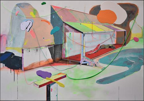 | Plus connu en tant qu’auteur et illustrateur de livres pour la jeunesse, scénographe dessinateur de presse et enseignant, Michel Galvin a aussi, depuis longtemps, une pratique picturale autonome. Ses grandes peintures, sur des panneaux de bois, exhalent la jovialité d’un monde emprunté à l’enfance, dans lequel des fils de scoubidou colorés assurent une communication extra-picturale entre des formes ectoplasmiques et des fragments d’objets parfois reconnaissables. Leurs couleurs sont vives, le tout s’épanchant dans des architectures suggérées, plus improbables que réelles. De sa démarche, Michel Galvin écrit : « Je peins des espaces de jeu, un monde in progress, à mi-chemin entre la nature morte et le paysage, où des structures construites à la façon d’un jeu de construction de l’enfance prennent place, apprêtées d’un réseau plus ou moins continu de câbles, fils plastiques, écho du jouet là encore. Une mise en chantier ludique, mise en scène des carnes et des os, sous l’empire du réel muet en mouvement que symbolise l’irruption brutale de formes pré-signes… » Les objets, communiquant entre eux par des fils brinquebalant sur la surface peinte, peuvent, selon l’humeur du spectateur, évoquer des pièces de boucherie sur un étal, des piles de matériaux de construction, des échantillons minéralogiques, des flaques liquides, des amibes ou des êtres unicellulaires démesurément agrandis… Leur rencontre, sur le subjectile semble aussi peu prévisible que celle du parapluie et de la machine à coudre sur la table de dissection chère à Lautréamont. En cela, pour notre plus grand plaisir, Michel Galvin s’inscrit dans la tradition surréalisante joyeuse et débridée qui, d’Yves Tanguy à Hervé Télémaque, chamboule facétieusement les normes picturales et nos habitudes perceptives… |