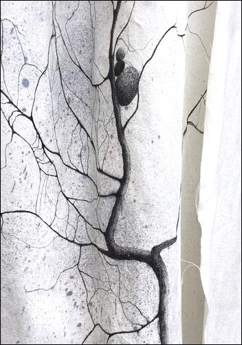| La fibre végétale, la toile de lin et le papier sont les matériaux de prédilection de Frédérique Gourdon. Sa pratique consiste à détramer la toile et utiliser les fils de trame ainsi extraits, avec des fils de coton et de l’encre de Chine, pour réaliser des dessins qui déstructurent l’espace, le muant en une sorte de peau fragile et diaphane qui évoque la fragilité et l’inexorable usure du temps. Elle souligne le caractère organique de sa démarche quand elle déclare : « Mon travail est le fruit de transformations par couches successives, comme l’arbre façonne ses anneaux. Ce temps du chemin est indispensable à la progression de l’évasion, et à la fixation de l’éphémère. » On ne peut s’empêcher de lire ses œuvres comme des images d’une peau qui aurait été arrachée – renouant ainsi avec la symbolique du mythe de Marsyas ou avec les représentations de la dépouille de saint Barthélemy – sur laquelle subsisteraient les traces de vaisseaux sanguins. L’empreinte du temps sur la nature qui nous environne est au cœur de ses préoccupations. Pour elle, l’œuvre, dans le processus de son élaboration comme dans celui de sa lecture par le regardeur, requiert un cheminement indispensable, un investissement personnel, un engagement… Ce n’est qu’au prix de cet effort que peuvent émerger de nouveaux espaces poétiques, des pistes pour une investigation autre du monde, une ouverture vers des perspectives insoupçonnées, sources de remise en cause des carcans des conventions de tous types. Il nous est ainsi proposé, à l’instar du détramage et du retissage de la toile, une démarche de déconstruction du monde sensible et de sa reconstruction selon des règles et des critères qui échappement aux normes communément admises. En suivant le fil conducteur de la trame et du dessin au trait, nous sommes invités à emprunter des passages inexplorés, à vivre des errances enrichissantes, à appréhender nos propres fragilités, à prendre conscience de l’usure du temps… |