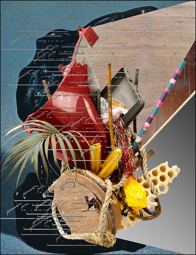 | Les images hybrides de François Martinache, fixes ou animées, confrontant, dans un même espace, réel et virtuel, résultent d’un processus complexe. Dans une première phase, l’artiste collecte, dans la rue, pendant son trajet entre son domicile et son atelier, des objets abandonnés, déchets sans valeur d’une société de consommation de masse ou reliques d’un passé tombé en désuétude. Il ramasse indifféremment des fragments de matériaux de construction, des emballages de repas vendus dans des fast-foods, des cannettes métalliques, une vieille lampe avec son abat-jour, un paysage peint sur une toile défoncée, des cordages, des boîtes de médicaments ou de drogues de substitution, des bocaux en verre, des fragments de mobilier, des plantes vertes… Il assemble ensuite ces éléments dépaysés, dans son atelier, pour réaliser des compositions instables et bancales, sans réelle volonté esthétique, mais plutôt à la recherche de postures inédites, de clins d’œil à l’histoire de l’art, de contradictions internes et, parfois de dérision et d’ironie. Il les photographie alors et injecte les clichés numériques ainsi produits dans des espaces où elles rejoignent des images d’origines les plus diverses : éléments 3D, accidents de visualisation informatique, scans 3D, peinture et collages numériques. François Martinache poursuit : « Une fois introduits dans l’espace virtuel ces objets se retrouvent en porte-à-faux, comme transposés dans un univers qui n’est pas le leur. […] Ils nous séduisent au premier abord et nous interrogent ensuite sur l’époque que nous traversons, à l’heure de la fracture numérique. Faisons-nous partie du monde d’avant ou de celui d’après ? Ou, tout simplement, nous situons-nous sur un point de rupture, une frontière ? » Tout ceci a pour effet de mettre le spectateur dans une situation inconfortable, dans laquelle il perd les notions de temps et d’espace, se débattant dans un magma chaotique dans lequel il devient difficile de distinguer les vrais des fausses valeurs, le réel du virtuel. |