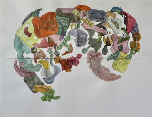 | Depuis plus de quatre ans, Olga Rochard se consacre à une série de grands dessins intitulés Le 7e Continent. Ce septième continent, c’est celui, immergé, des déchets de matière plastique qui se dégradent, à notre insu, au fond de l’océan Pacifique et ailleurs, compromettant de façon sournoise et pernicieuse un avenir bien plus proche que nous le pensons. L’artiste commence par mouler des fragments d’emballages alimentaires qu’elle utilise comme des matrices creuses pour produire des volumes colorés, en cire ou en plâtre. Elle collectionne ces solides élémentaires, dont l’origine n’est pas immédiatement identifiable et, ce, d’autant moins qu’elle peut les hybrider avec d’autres. Elle puise alors dans ce répertoire de modèles, qu’elle n’hésite pas à transformer ou déformer, pour produire ses dessins, réalisés à l’aquarelle et au graphite sur des feuilles de papier de format raisin (65 x 50 cm). Assemblées à touche-touche, ces modules de base finissent pas constituer de grandes compositions qui semblent pouvoir se développer à l’infini, ce que l’artiste ne s’interdit pas de faire en ajoutant de nouvelles feuilles qui poursuivent le dessin au-delà de ses limites initiales. Le résultat est simultanément séduisant et inquiétant. La notion d’échelle et le rapport à une quelconque réalité y sont abolis. Il pourrait indifféremment s’agir de la vue au microscope d’un bouillon de culture ou de la cartographie d’un archipel observé depuis un satellite, d’un cadavre exquis ou d’un relevé topographique rigoureux, de matérialités concrètes minutieusement consignées ou de divagations oniriques affranchies de toute pensée consciente, de formes familières et reconnaissables ou de monstres issus de l’imagination… Les motifs semblent flotter dans un all-over qui stimule l’imagination du regardeur, invité à abandonner ses repères familiers pour s’immerger dans un univers qu’il verra, selon son humeur, ses fantasmes, ses souvenirs ou ses expériences personnelles, comme protoplasmique ou structuré, mais dans lequel les notions de temps et d’espace se dissolvent. |