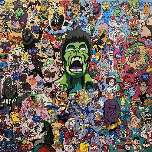 | Léonard Alixant est un très jeune artiste – tout juste vingt ans – qui cherche à imposer sa marque dans le monde des arts en s’exprimant par le dessin, utilisant, de façon quasi exclusive, des marqueurs acryliques. Ses toiles, qui s’inscrivent dans la descendance du Pop-Art, frappent d’emblée par leur richesse chromatique et par le grouillement des personnages qui constituent leur fond. On y reconnaît des icônes d’une culture populaire de plusieurs générations ou des figures inventées, juxtaposées sans cohérence d’échelles et sans ordre apparent, constituant une sorte de mur compact et bariolé sur lequel une figure centrale – souvent le chien de l’artiste, grimé en héros de bande dessinée –, de plus grandes dimensions, se détache et prend à parti le spectateur. L’artiste déclare improviser en partant d’un point de la surface blanche, laissant son crayon l’entraîner dans un processus à caractère génésique qui finit par saturer tout l’espace libre. Pas de perspective ni de profondeur dans ces all-over qui donnent le vertige à qui veut bien prendre le temps d’en analyser le contenu. Pas d’histoire ou de narration, non plus, mais des fragments visuels qui veulent entrer en résonance avec les souvenirs d’enfance du spectateur, quelle que soit sa génération, pour peu qu’il ait fréquenté, à un moment ou à un autre, l’univers des comics. |