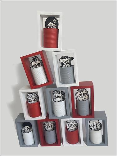 | Hervé Bourdin jette, dans ses installations, un regard acide, corrosif, décapant, mais aussi rempli d’une profonde empathie pour les personnages qu’il met en scène. Tragédie et grotesque s’y côtoient toujours. Par certains aspects, son graphisme évoque celui de la bande dessinée, domaine que l’artiste a investi en produisant des albums qui donnent à ses compositions une dimension narrative plus explicite. Il ne recherche pas l’effet plastique, comme le font tant d’artistes de notre temps : la forme reste seconde par rapport au sens et vient comme un supplément pour appuyer le propos. Un propos direct, qui rejette la métaphore, pour placer le spectateur face à ses responsabilités. Ses œuvres se comportent, en quelque sorte, comme des miroirs réfléchissant notre propre indifférence, notre propre inhumanité. Ses installations récentes recourant à des matériaux de récupération, notamment des boîtes de conserve, illustrent, en termes plastiques et avec un humour grinçant, les effets des récents confinements que nous avons dû subir. L’humanité, condamnée à se nourrir de conserves et recluse dans ces mêmes boîtes… Et transformée en jeu de foire, en chamboule-tout… Ses personnages, à moitié dissimulés, jouent-ils à cache-cache avec le spectateur ou se comportent-ils en survivalistes apeurés par un avenir incertain… La question reste ouverte… |