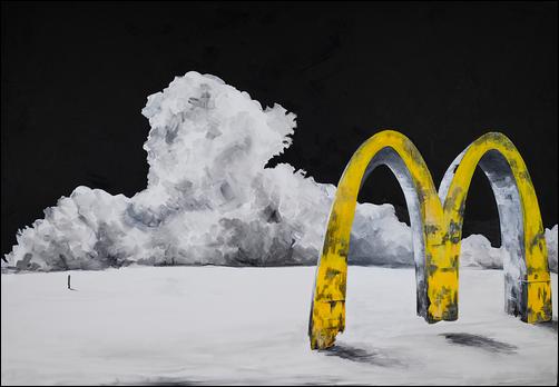 | Les peintures faussement hyperréalistes, en camaïeu de gris, d’Hadrien de Corneillan doivent à la peinture étasunienne, que ce soit aux sites industriels de Charles Demuth ou Charles Sheeler, à la fossilisation ou à la neutralisation des personnages chez Edward Hopper et, surtout, aux toiles et aux photographies en noir et blanc de paysages ouverts d’Ed Ruscha, sur lesquelles figure, parfois, comme chez notre artiste, une légende écrite, intégrée à l’œuvre. Le parallèle s’arrête ici, car, chez Hadrien de Corneillan, on remarque une prédilection pour les reliques d’activités humaines, les no man’s lands et les déserts qui le rattachent plutôt à un certain romantisme européen, d’Hubert Robert à Caspar David Friedrich, par exemple. Cependant, les ruines, les friches industrielles et les espaces abandonnés de ce peintre n’ont rien de réel. Ils ne sont ni présents ni passés. Ils évoquent peut-être un futur menaçant si l’Homme persiste dans son attitude de consommation incontrôlée des ressources limitées de notre planète. Pour autant, le propos n’a rien de moralisant ni de pontifiant. Il recourt à des traits d’un humour grinçant ou à des mises en scène surréalisantes – un conteneur de transport maritime échoué sur une plage, un chien errant en plein désert, un immense buste de Lénine sortant de la mer devant un cosmonaute casqué… – qui génèrent un sentiment d’étrange familiarité – l’Unheimlichkeit freudienne –, laquelle renvoie le spectateur à ses propres réflexions et méditations. |
