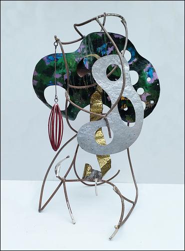 | Marc Guillermin, décorateur, ferronnier et dinandier de son état, développe aussi une production artistique autonome à base de pièces métalliques. De son travail de plasticien, il écrit : « Je conçois des structures aux formes aériennes, en tôles martelées, des accumulations de formes, j’imagine des constructions méditatives semblant en lévitation, des pièces inspirées des cycles mouvants, vagues, nuages, flammes, des structures démontables, des expériences sonores où s’entrechoquent des pièces bruyantes, des installations comme des corps vivants où circulent des flux énergétiques, je construis des raccords aux couleurs vives, des branchements, des greffes, je fais pousser des végétations poétiques postindustrielles, des fruits libérant leur énergie… » Il en résulte des univers inattendus, aériens, aquatiques ou terrestres, dans lesquels la dimension fonctionnelle de chaque pièce est occultée au profit d’un propos apparemment chaotique. À l’analyse, ce chaos est savamment structuré pour alimenter le questionnement et la rêverie du spectateur, invité à trouver des usages nouveaux à ce qui lui est donné à voir. Les assemblages hybrides et insolites de Marc Guillermin constituent autant de machines à penser, non pas en ce qu’elles pourraient se substituer à notre intelligence mais parce qu’elles la stimulent et la forcent à investir des univers qui nous sont habituellement fermés. |