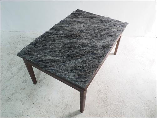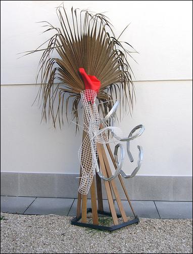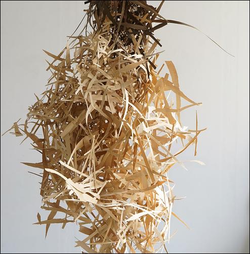 | Pascale Ract se déclare proche de l’artisanat, avec un souci permanent pour les matériaux, les gestes des métiers manuels, les processus du travail de création, l’intégration des produits dans leur environnement… Dans son atelier, elle fabrique ce qu’elle appelle des pièces détachées, réalisées avec des matériaux collectés – qui la touchent sans nécessairement savoir pourquoi – lors de ses voyages ou de ses promenades, puis rangés sur les étagères de son atelier, quelquefois pendant de nombreuses années, en l’attente d’une opportunité propice à leur utilisation. Elle les assemble alors dans des structures, plus ou moins grandes, souvent suspendues, parfois in situ. Dans ses sculptures récentes, elle utilise des chutes de bois de placage conservées sans idée prédéfinie de l’usage qu’elle pourrait en faire. À force de les regarder empilés, ces morceaux de bois l’ont interpellée : un appel irrésistible, déclare-t-elle. Elle les a assemblés dans des structures proliférantes suspendues. La verticalité des compositions résultantes leur confère une gravité et un volume qui faisait défaut, dans leur destination primitive, aux matériaux qui les constituent. On y perçoit aussi un écho au travail, à l’énergie des artisans dont ils sont les témoignages de l’activité. Nous sommes, chez Pascale Ract, bien au-delà d’une activité de recyclage de déchets, dans un univers de recréation plastique, de réanimation ou de revitalisation d’objets, suggérant des usages autres pour des choses qui nous sont trop familières et qui ont perdu leur âme à force d’être banalisées. |