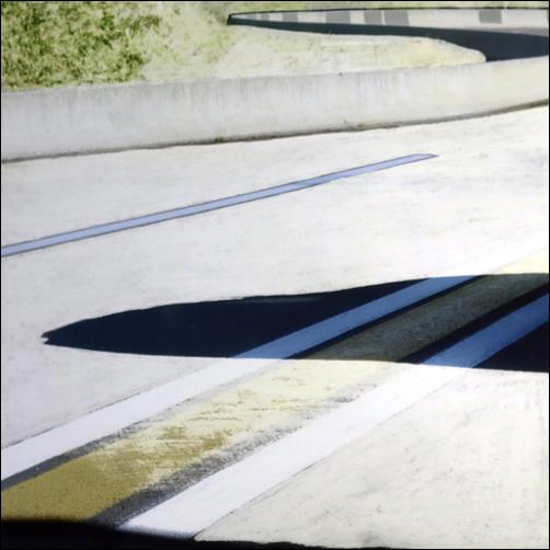 | La technique d’Aline Isoard est complexe et minutieuse. Elle prend des clichés photographiques, les imprime en haute résolution avant de se livrer à un travail de dépigmentation de certaines plages en ôtant l’encre des parties qu’elle juge inintéressantes ou de nature à nuire à l’équilibre de sa composition. Les photographies sont prises depuis le siège du passager à l’avant d’une automobile à l’arrêt, roulant ou dans une station de lavage. La position dans l’habitacle d’un véhicule offre plusieurs points de vue, en avant, en arrière ou latéralement, à travers les fenêtres que sont le pare-brise, la lunette arrière, les rétroviseurs et les portières. Le travail de grattage élimine l’essentiel des autres détails, ne laissant subsister que quelques traces du tableau de bord, du monogramme, des vignettes ou du volant, juste pour rappeler le contexte de la prise de vue. Il en résulte des images abstraites, dans lesquelles les indices sur la prise de vue se camouflent au spectateur derrière un jeu de paradoxes. La présentation de ces clichés est complétée par quelques sculptures constituées de photographies imprimées sur rhodoïd puis collées sur des verres assemblés. Passant dans la troisième dimension, elles flottent librement dans l’espace transparent, donnant à voir leur envers sans être soumises au cadre. |