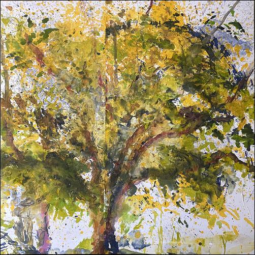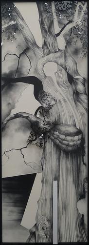 | Anne Moser pratique la peinture, occasionnellement la céramique. Dans ses peintures, elle s’inspire de la nature, travaillant sur le motif, en extérieur, sur des papiers qu’elle reprend dans l’atelier, transcrivant sur toile ses perceptions, observations et impressions : structure des végétaux, lumière, atmosphère, vent… Son recours aux encres et à des papiers japonais fait référence à la peinture extrême-orientale mais elle s’affranchit des stéréotypes et modèles dépersonnalisés de cet art au profit d’une gestualité qui révèle des aspects de sa personnalité. De cette démarche, Caroline Adler écrit : « En investissant tout son corps, dans un élan venant d’un moment de méditation, d’un temps de marche, Anne dévoile l’invisible du paysage. Énergie révélée par des troncs ou des branches, imposants, à l’encre noire ou en couleur… atmosphères subtiles qui nous entraînent dans le tableau… » Il y a du vécu, de l’introspection, une forme de familiarité amoureuse, dans les œuvres résultantes qui nous révèlent, dans une séduisante synthèse, simultanément le macrocosme de la nature et le microcosme de l’artiste. |