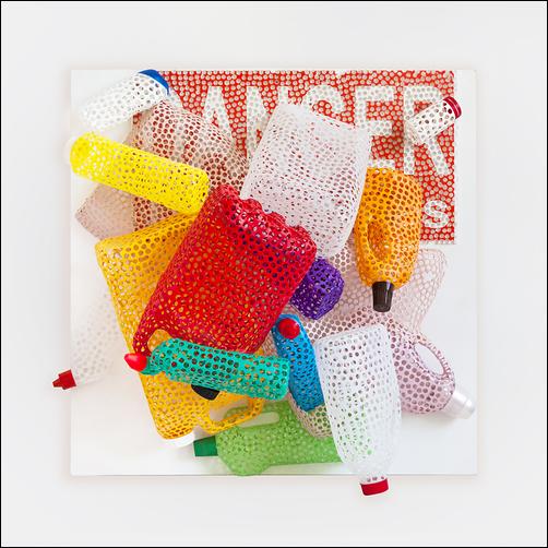 | Rach’mell, pseudonyme d’un artiste ayant fait carrière dans le monde du graphisme, affiche, dans ses productions plastiques, une certaine nostalgie du Nouveau Réalisme et du Pop’Art, notamment dans son exploitation d’objets du quotidien pour dénoncer surconsommation, gâchis et dilution des relations humaines. Il ne traite cependant pas ces thèmes avec le sérieux trop souvent pontifiant de certains artistes mais en recourant à une ironie parfois corrosive et toujours très colorée. Il affiche une prédilection pour les récipients – bouteilles, flacons, poubelles, bidons, jerrycans… – en matière plastique qu’il choisit essentiellement pour leurs couleurs intenses. Il les désactive, les rend inutilisables pour leur usage initial, en les perforant de façon plus ou moins régulière, laissant parfois apparaître, en creux, un slogan ou une injonction. Cette matière première, l’équivalent de la peinture sortant des tubes chez le peintre traditionnel, lui sert pour composer des tableaux muraux ou de vastes installations, procédant, dans les deux cas, par des accumulations rigoureusement pensées, construites et architecturées. Rach’mell se défend de vouloir nous livrer un message profond. Il souligne seulement, par le biais de la dérision et avec le sourire, que l’accumulation dénature les objets en leur conférant de nouvelles identités et de nouveaux usages, réels ou fantasmés, cocasses, voire inquiétantes. Et qu’il vaut mieux en rire que s’en lamenter… |